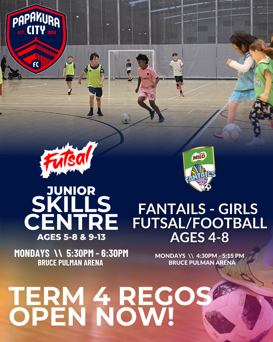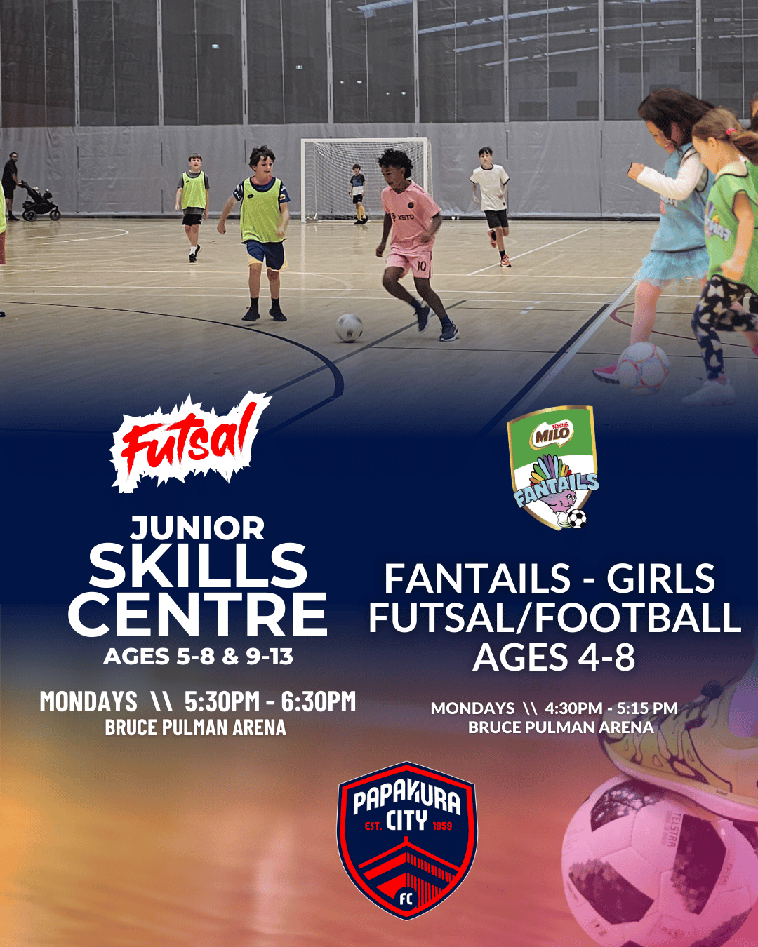 Futsal is a fast-paced indoor game that maximizes ball touches and meaningful interactions. This format builds players’ confidence in tight spaces and develops technical skills. While Futsal is its own sport, players can enhance their performance on the field, shaping them into well-rounded footballers as well.The Papakura City FC Futsal Skill Centre follows a structure of a movement game, a key skill game, and then ends with a Futsal match. All designed to have as many touches of the ball as possible.