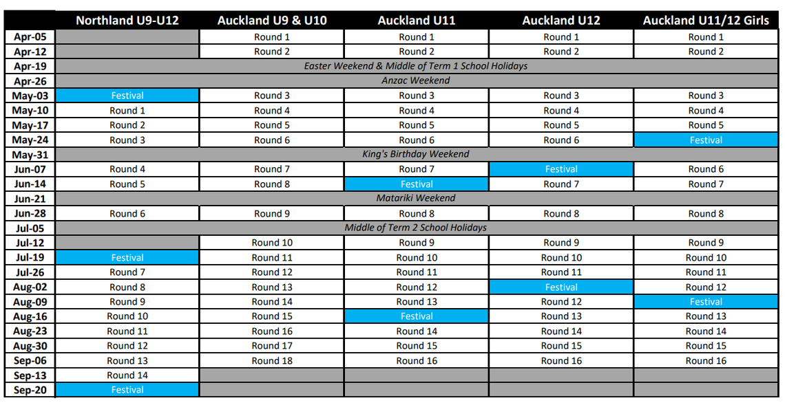 (no games Easter & ANZAC weekend, Kings Birthday Weekend, Matariki Weekend and 5th July subject to change by NRF)
